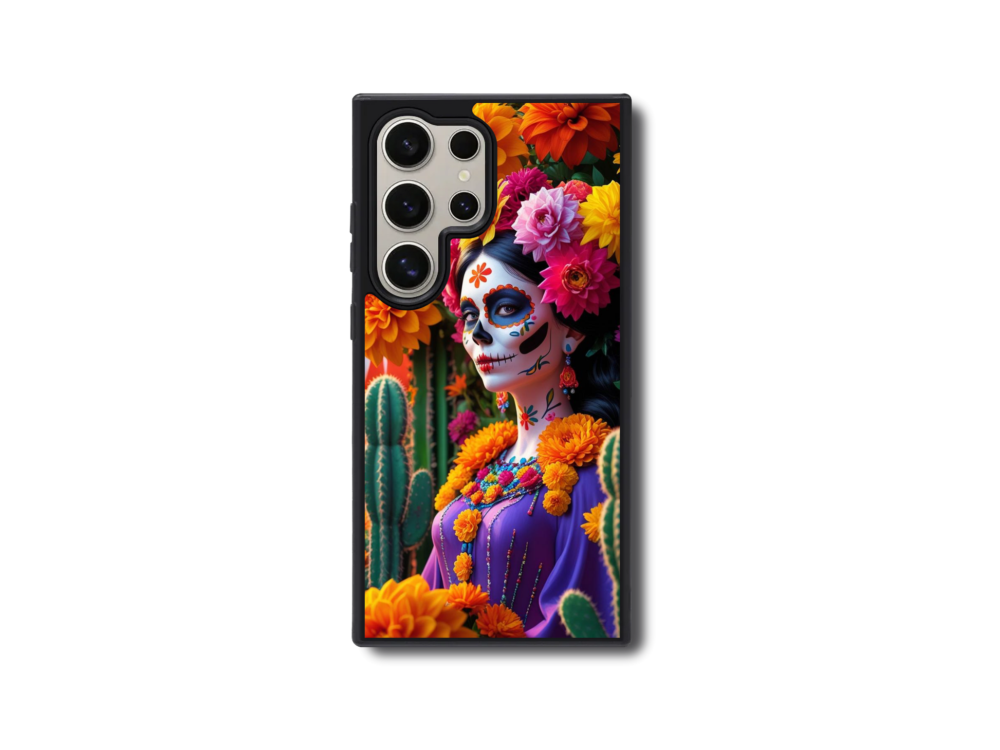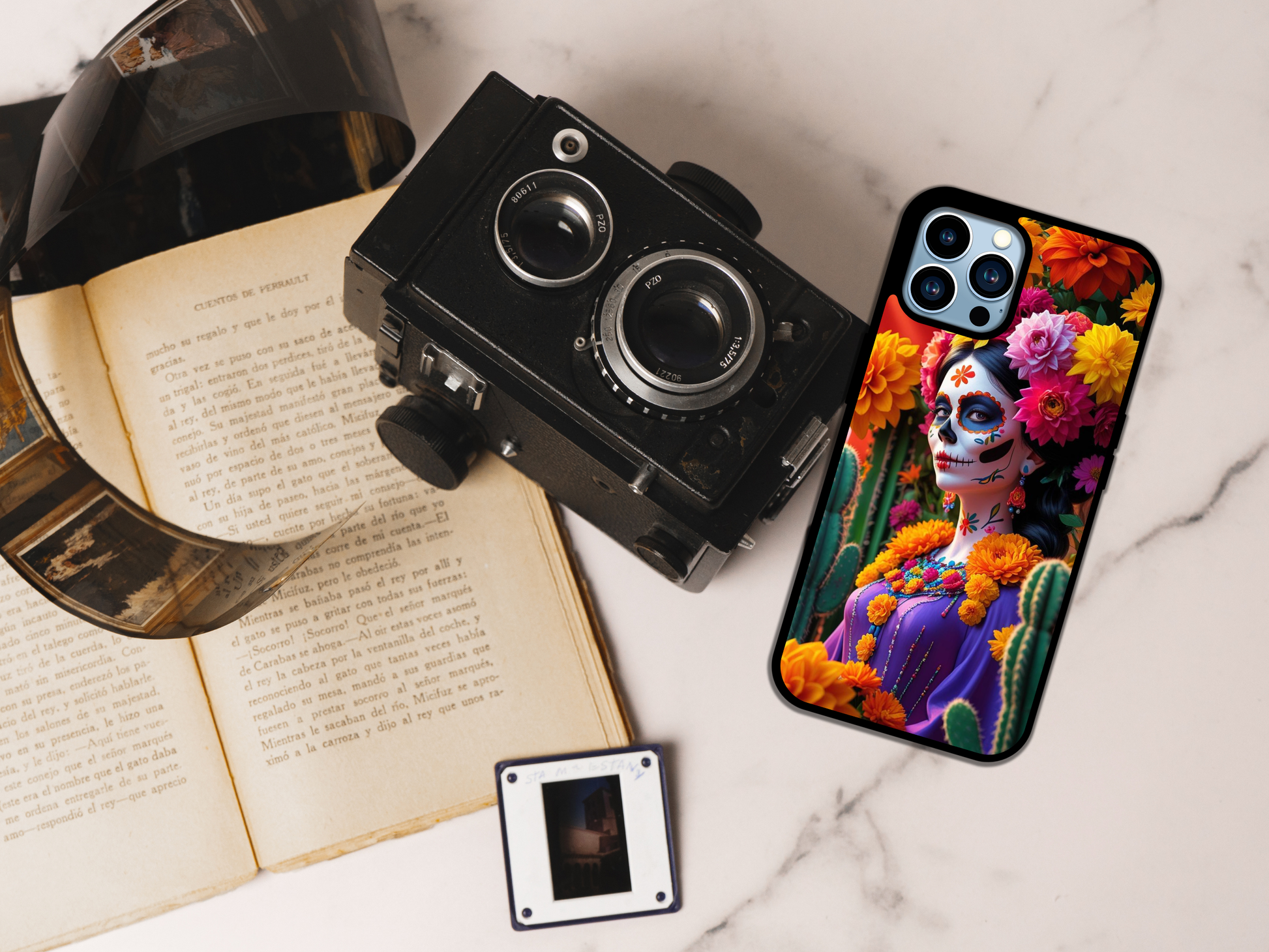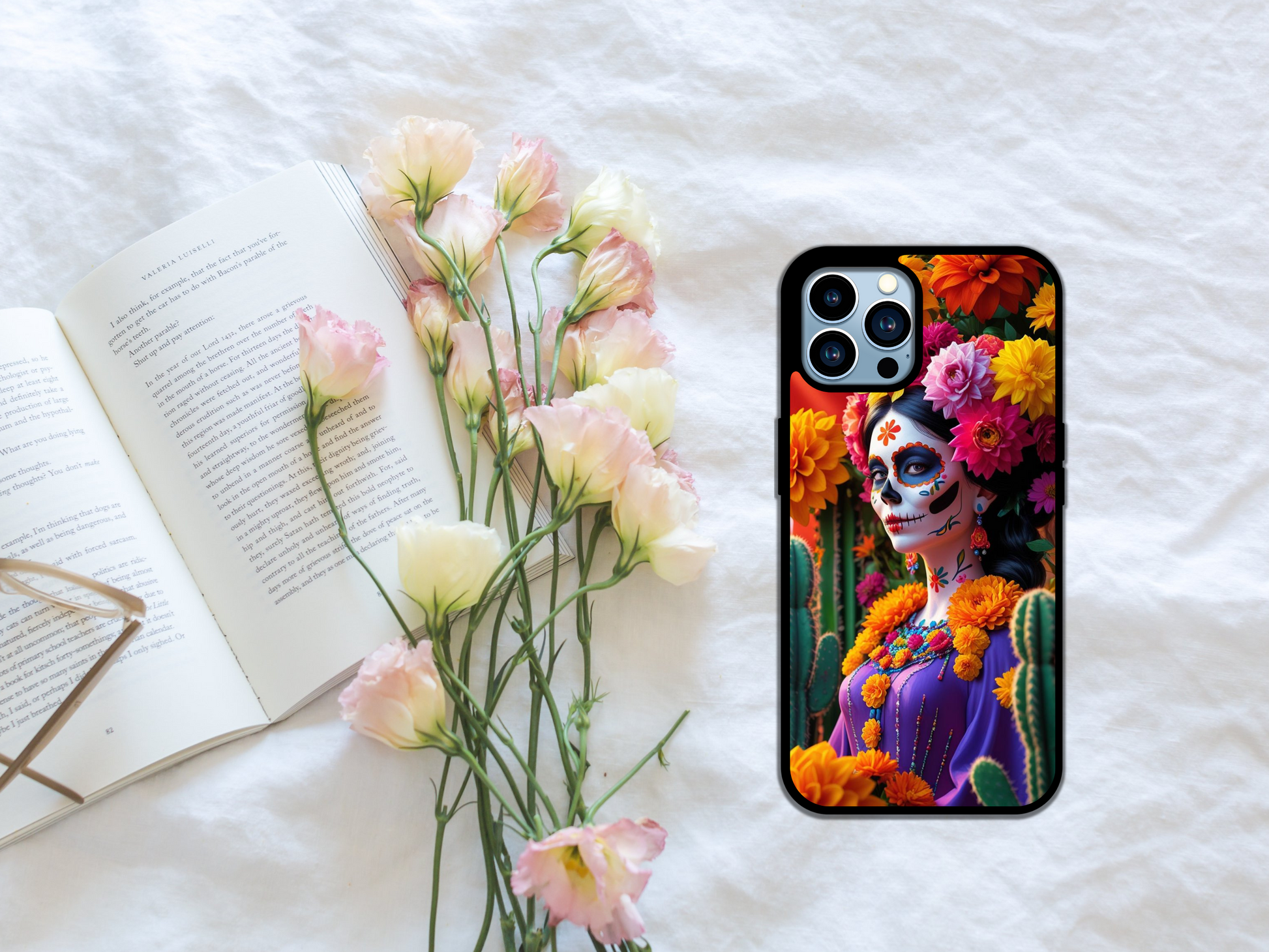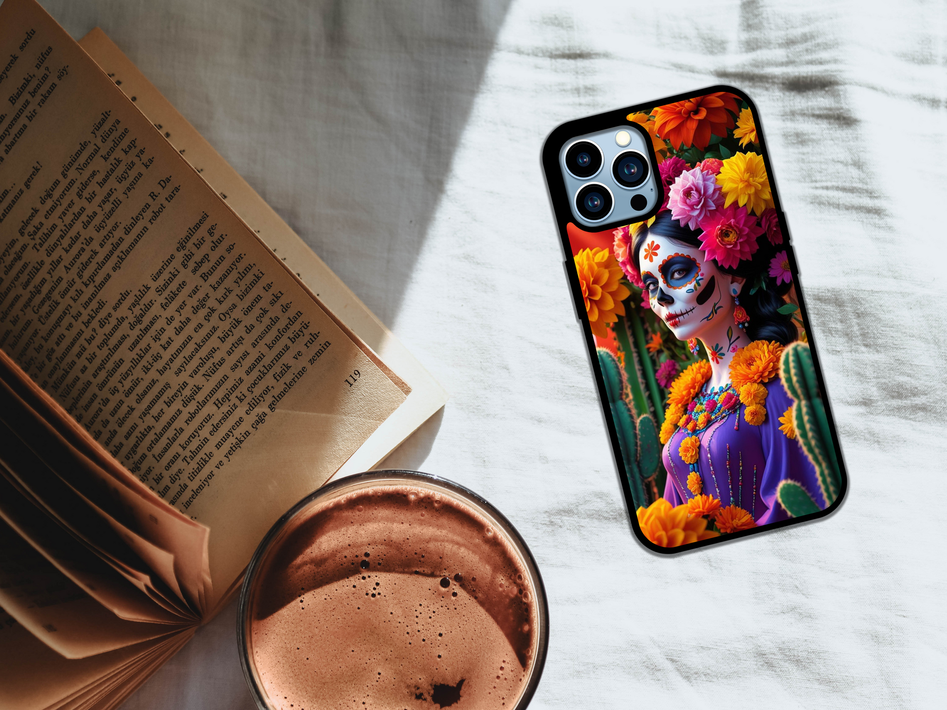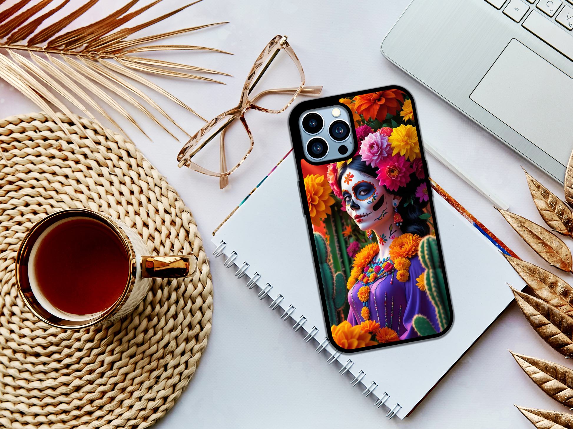 Celebrate the colorful spirit of Mexico’s Día de los Muertos with our Viva La Vida! phone case. This design features a beautifully detailed sugar skull makeup look surrounded by marigolds, cacti, and the proud Mexican flag, capturing the essence of honoring life and heritage.