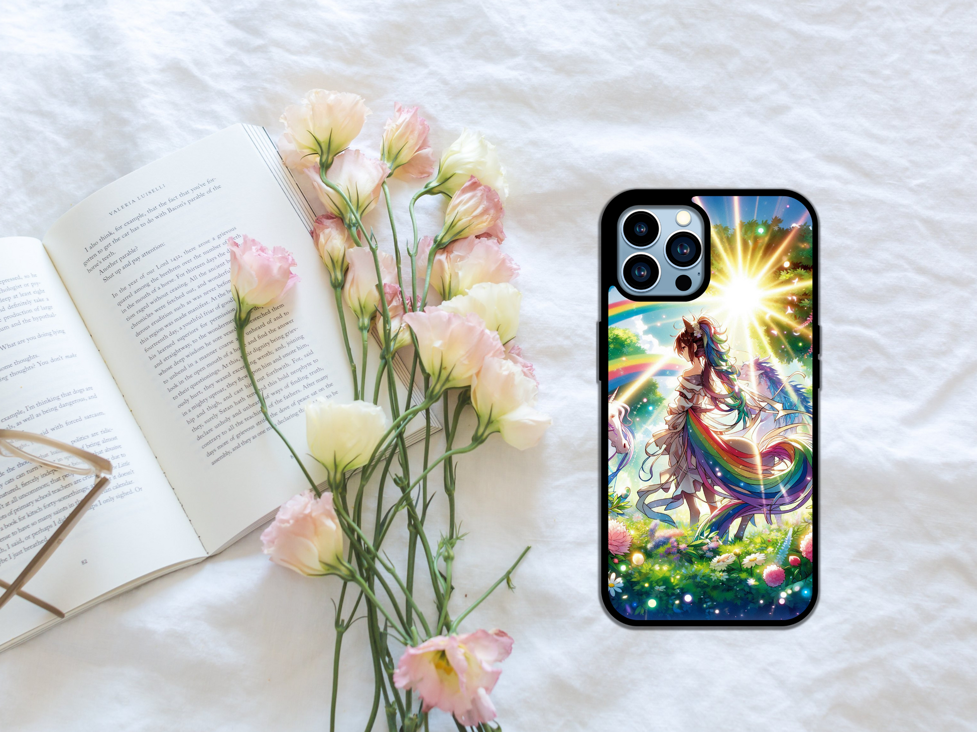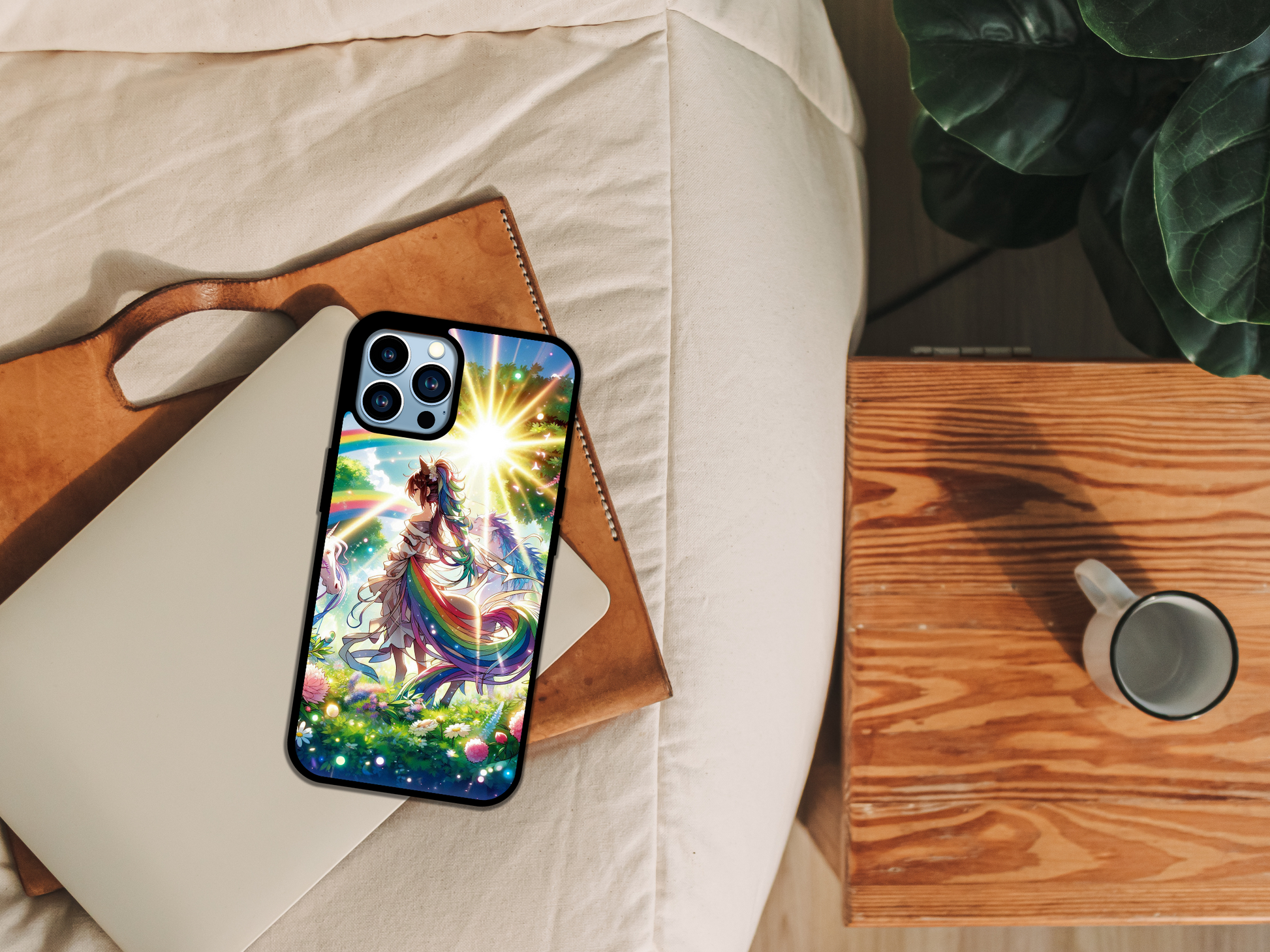 Celestial Harmony celebrates the magic of self-expression with a stunning anime-style goddess draped in flowing rainbow hues, surrounded by celestial light, blooming florals, and mythical unicorns. This phone case isn’t just art—it’s armor for your identity, radiating pride, hope, and divine energy.