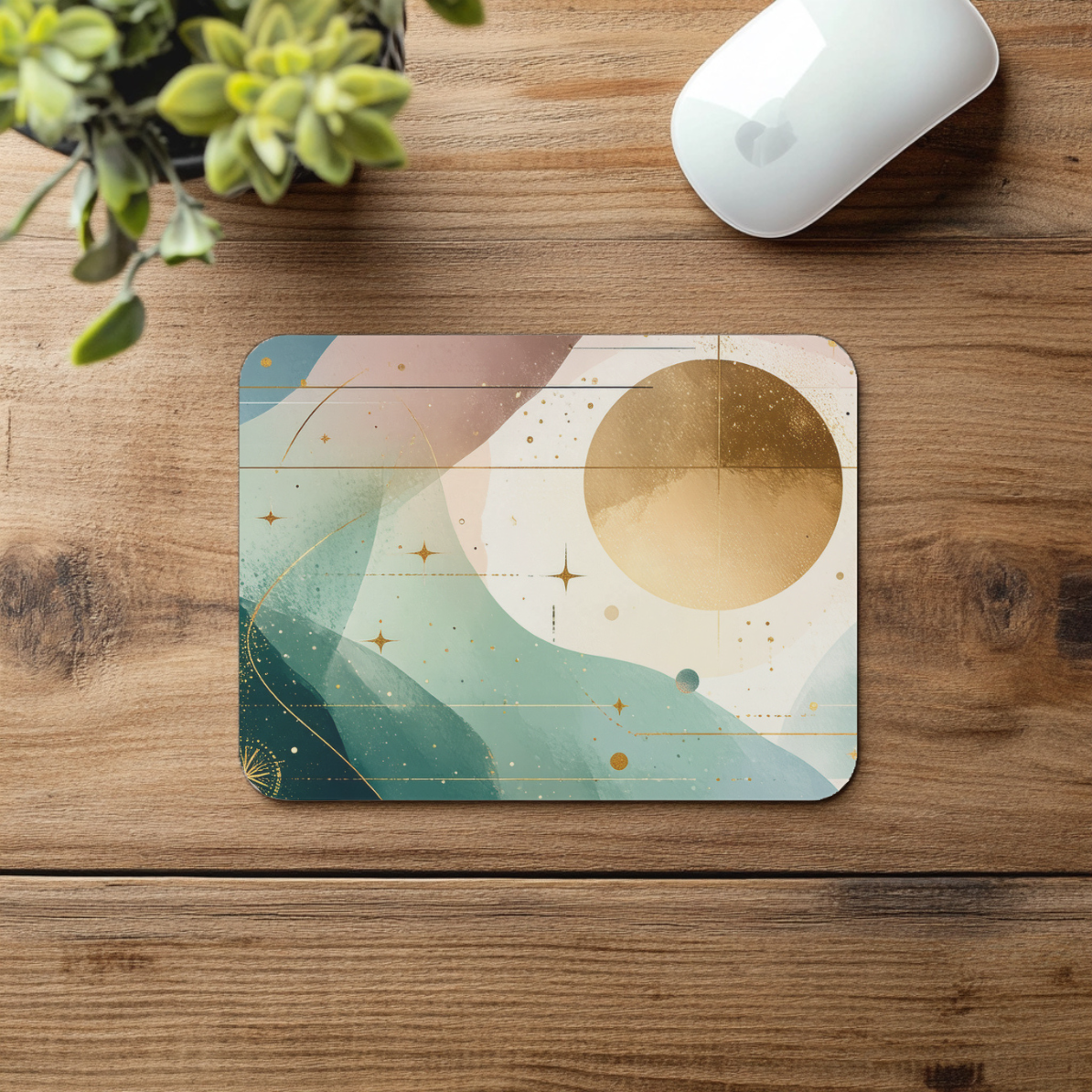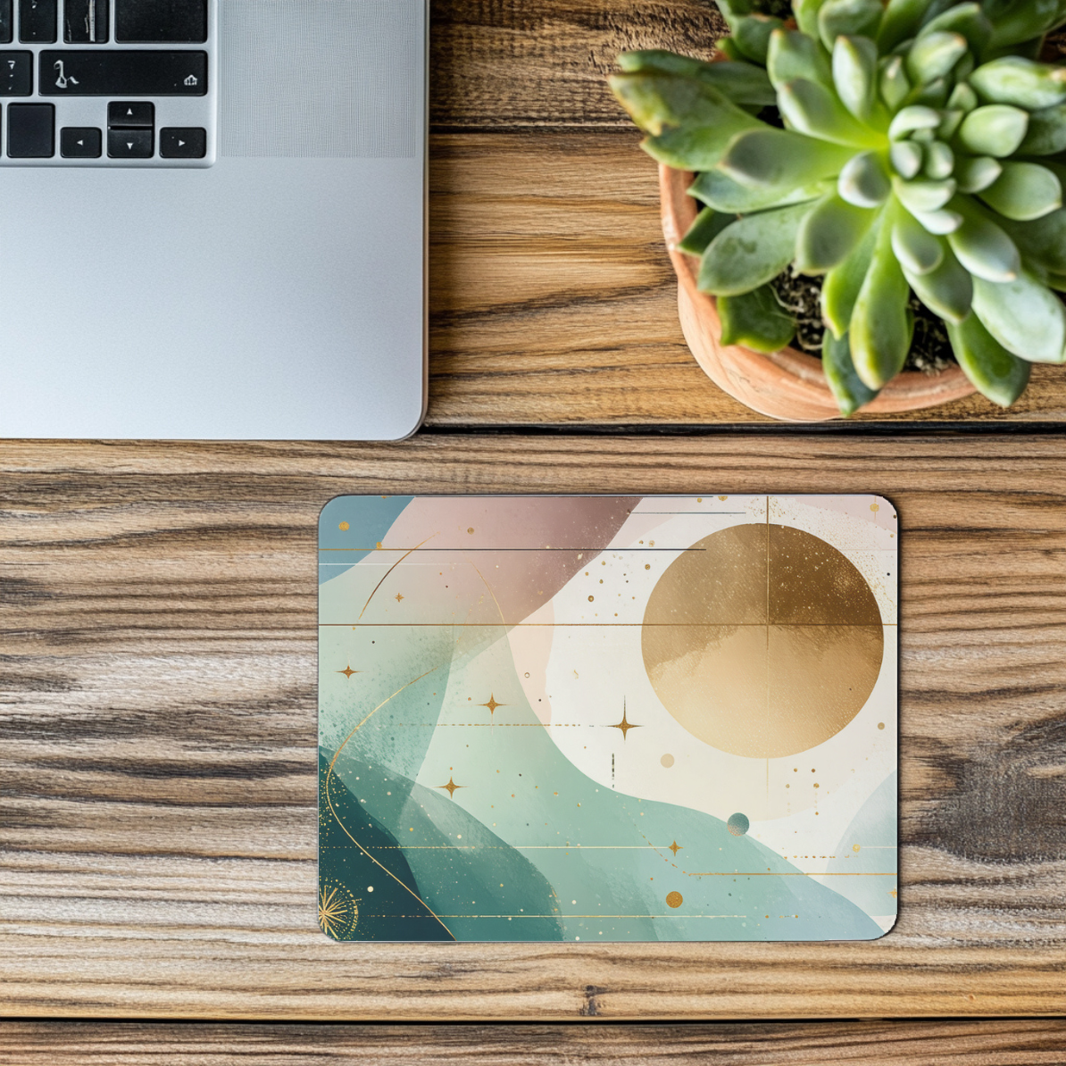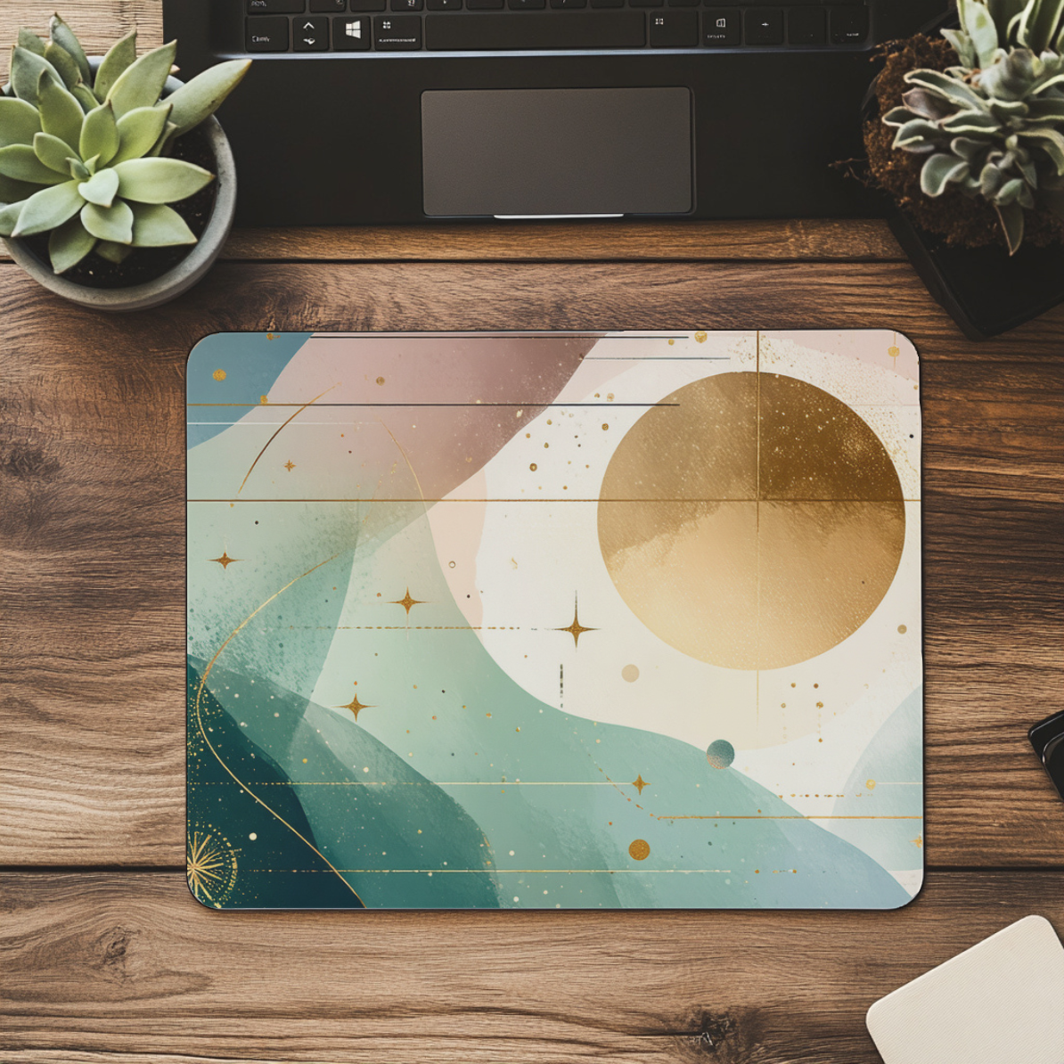 Elevate your workspace with the serene beauty of the Celestial Harmony Mousepad. Featuring a soft pastel color palette of teal, blush, and cream with touches of gold stars and abstract planetary orbits, this design brings a touch of cosmic tranquility to your desk. Perfect for dreamers, artists, and stargazers alike, this mousepad combines beauty and functionality for an inspiring workspace.
