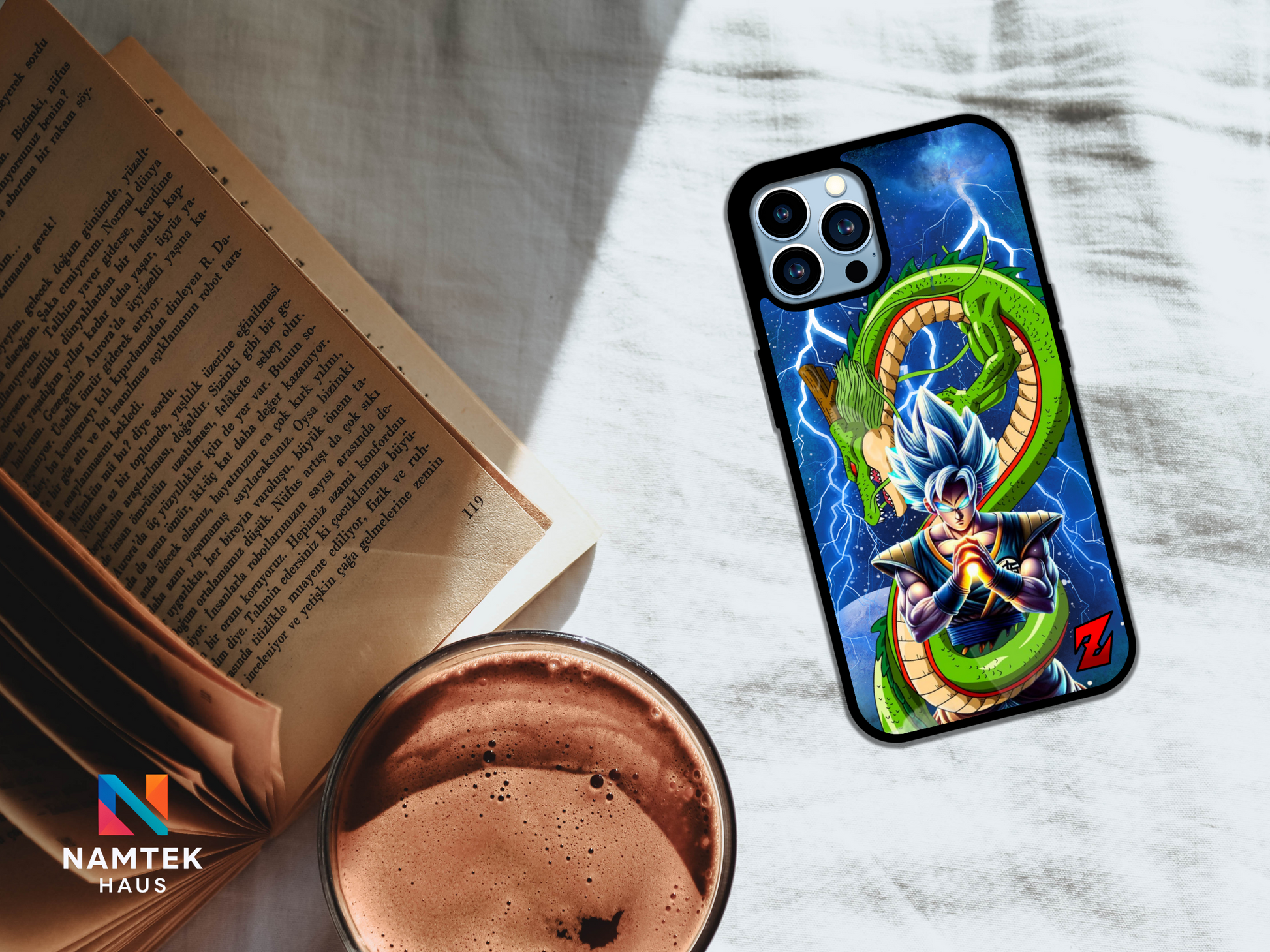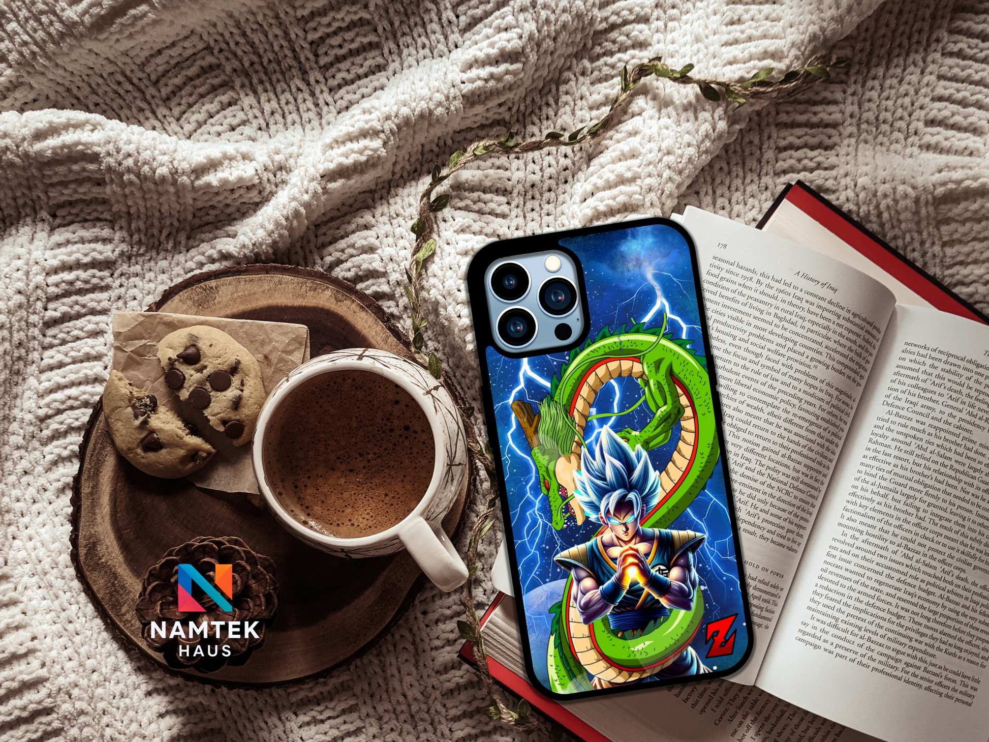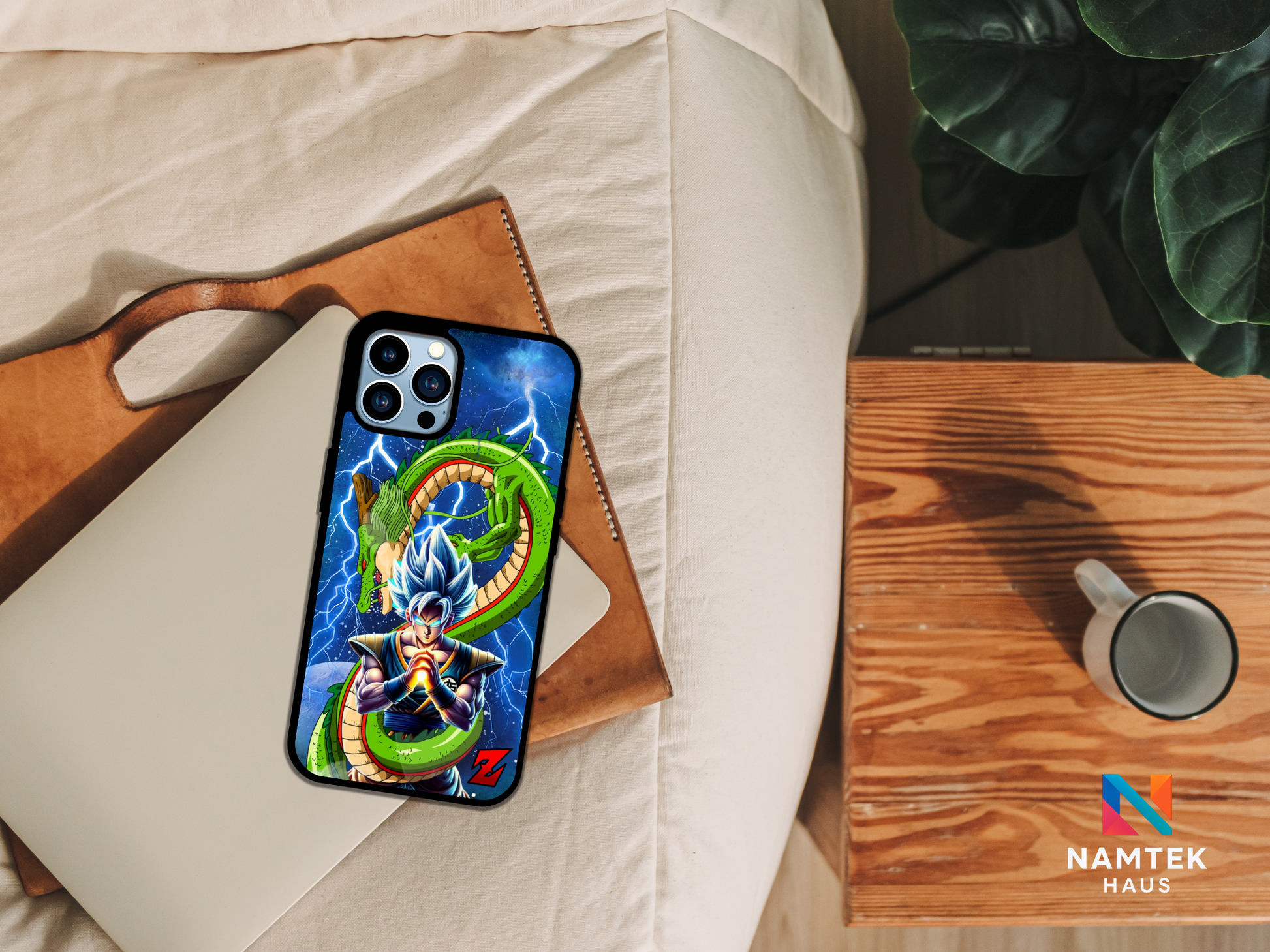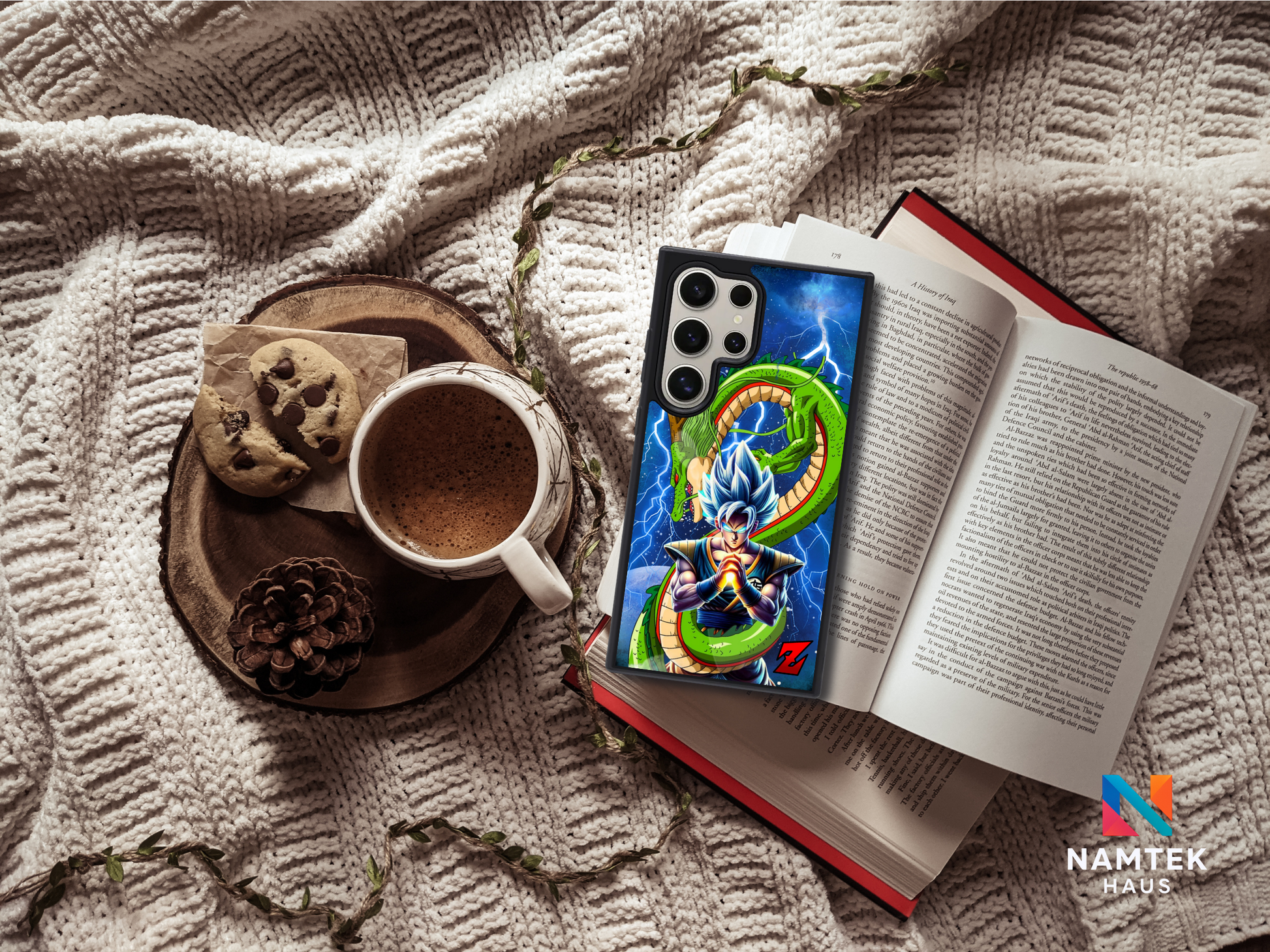 Unleash unstoppable power with this Super Saiyan warrior phone case. Featuring a fierce, silver-haired Goku channeling energy beneath a stormy sky, guarded by the legendary green dragon of the dragon balls, Shenlong. The high-definition artwork and vibrant lightning aura make this case a must-have for any anime action fan.