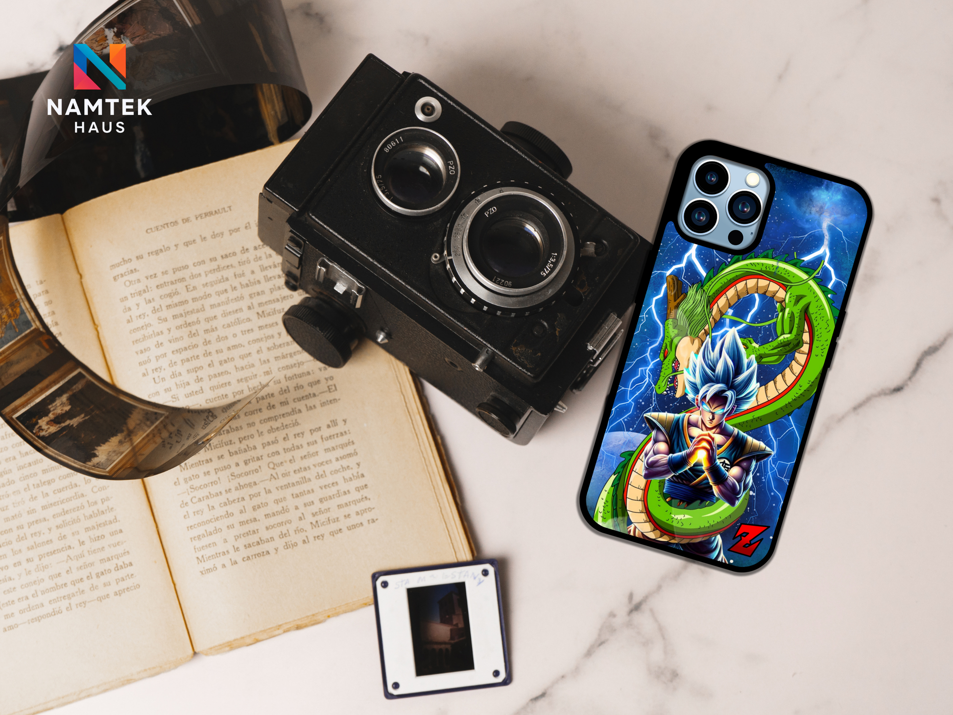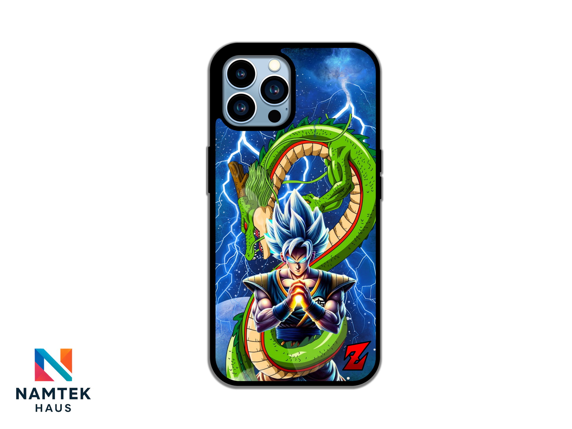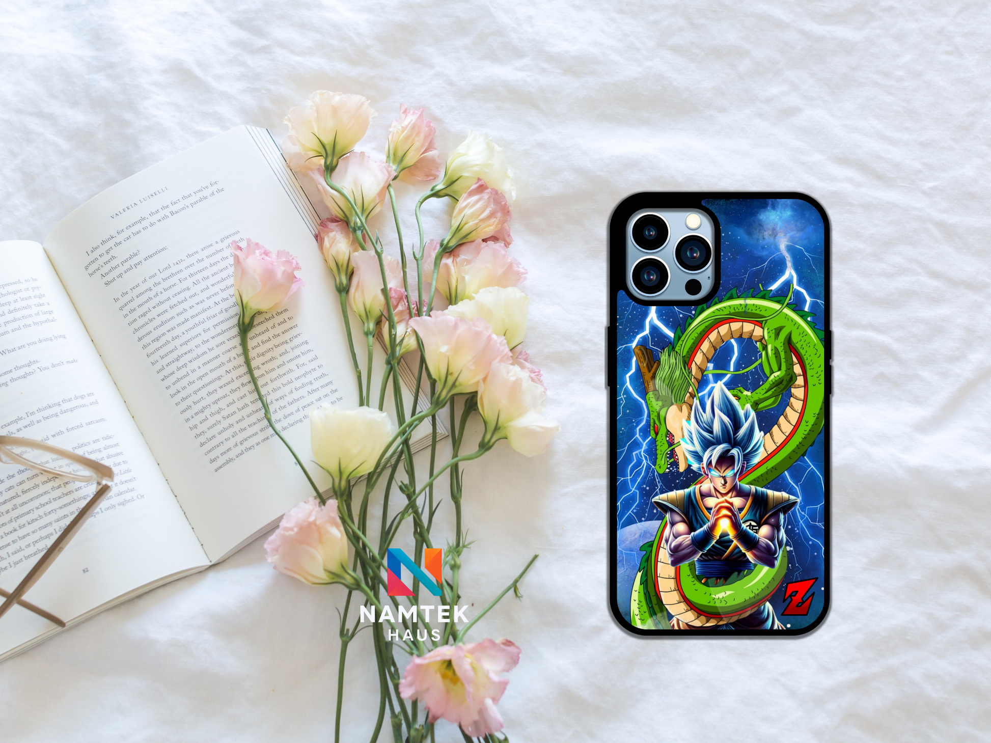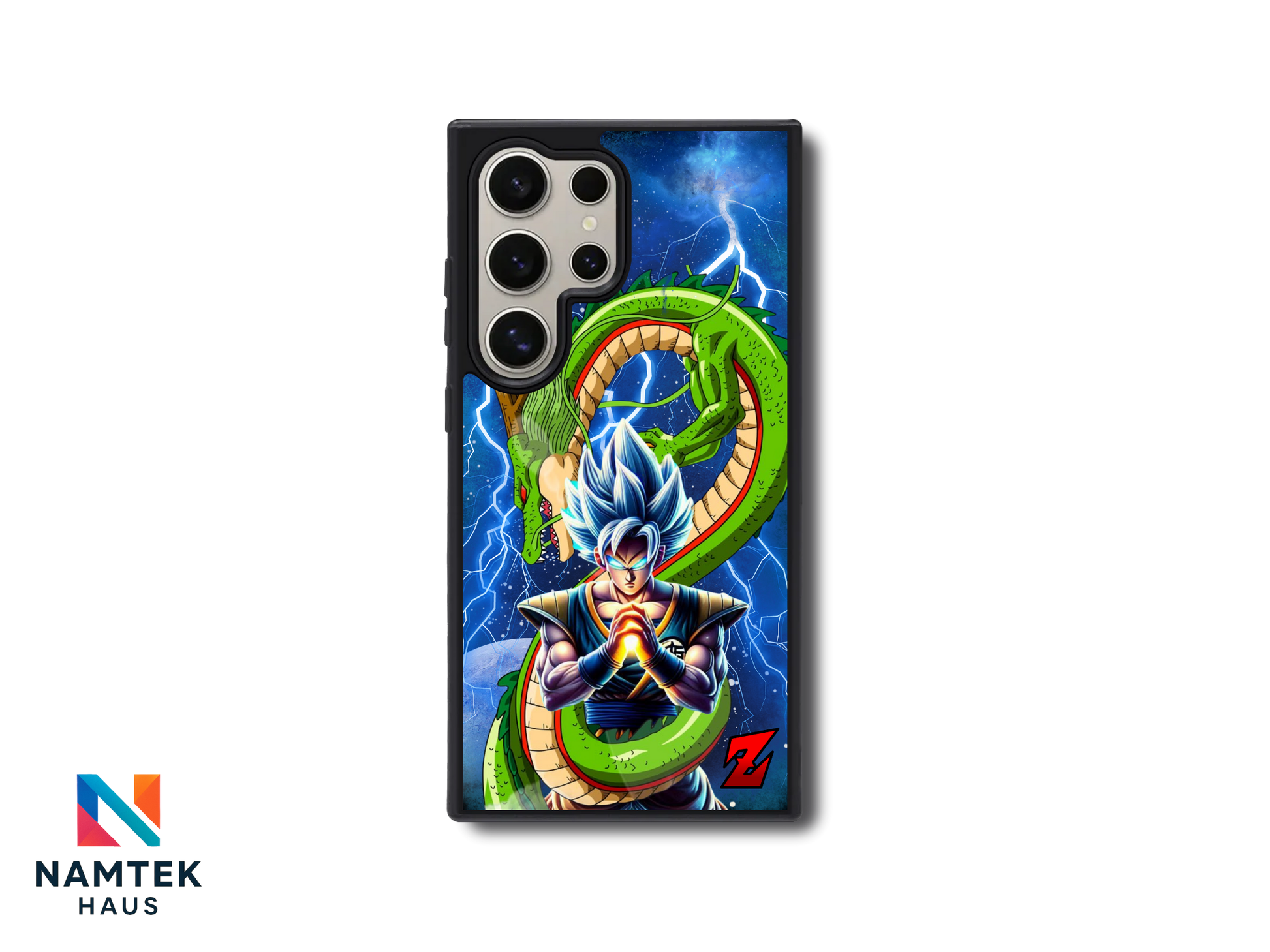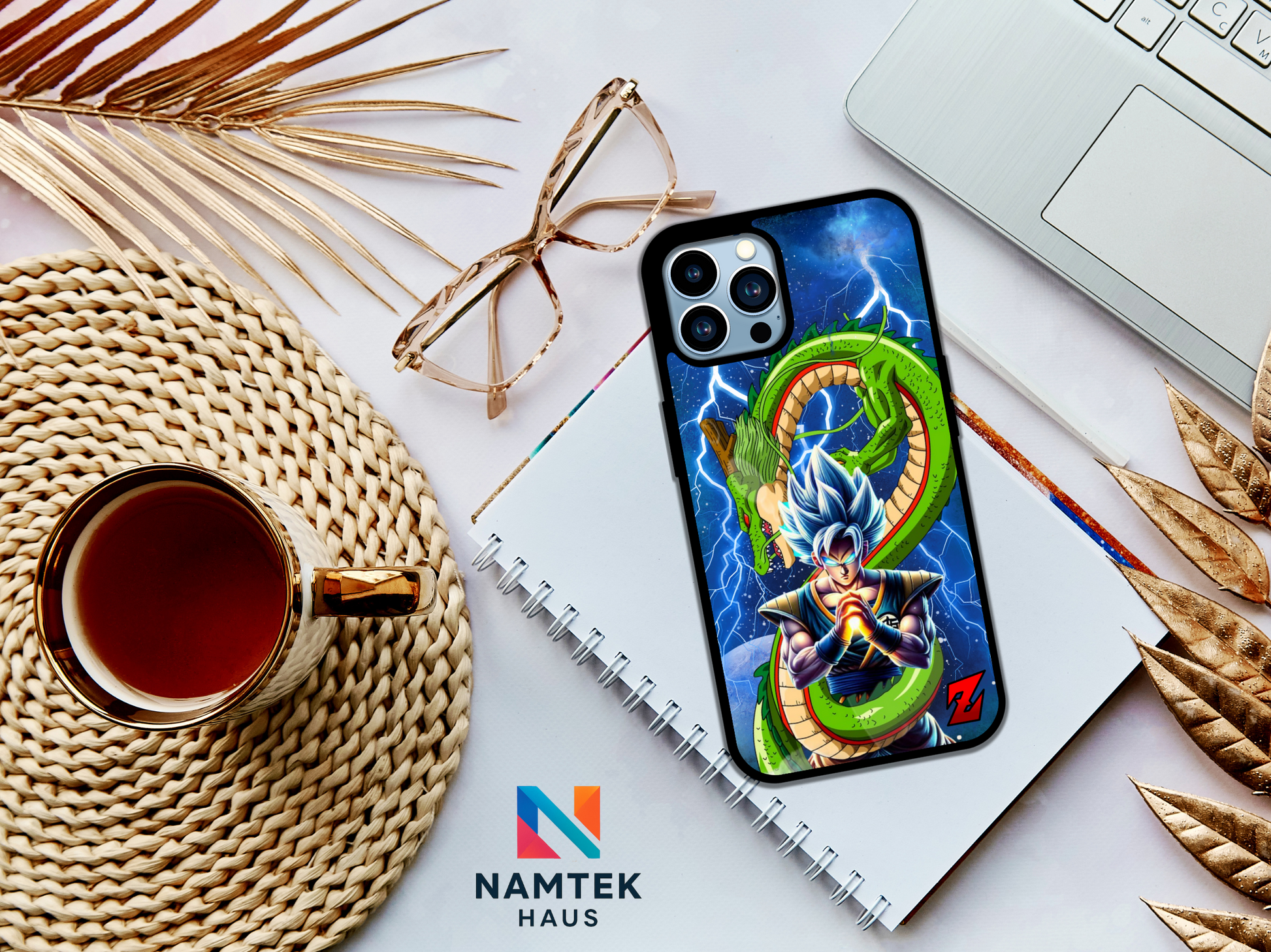 Unleash unstoppable power with this Super Saiyan warrior phone case. Featuring a fierce, silver-haired Goku channeling energy beneath a stormy sky, guarded by the legendary green dragon of the dragon balls, Shenlong. The high-definition artwork and vibrant lightning aura make this case a must-have for any anime action fan.