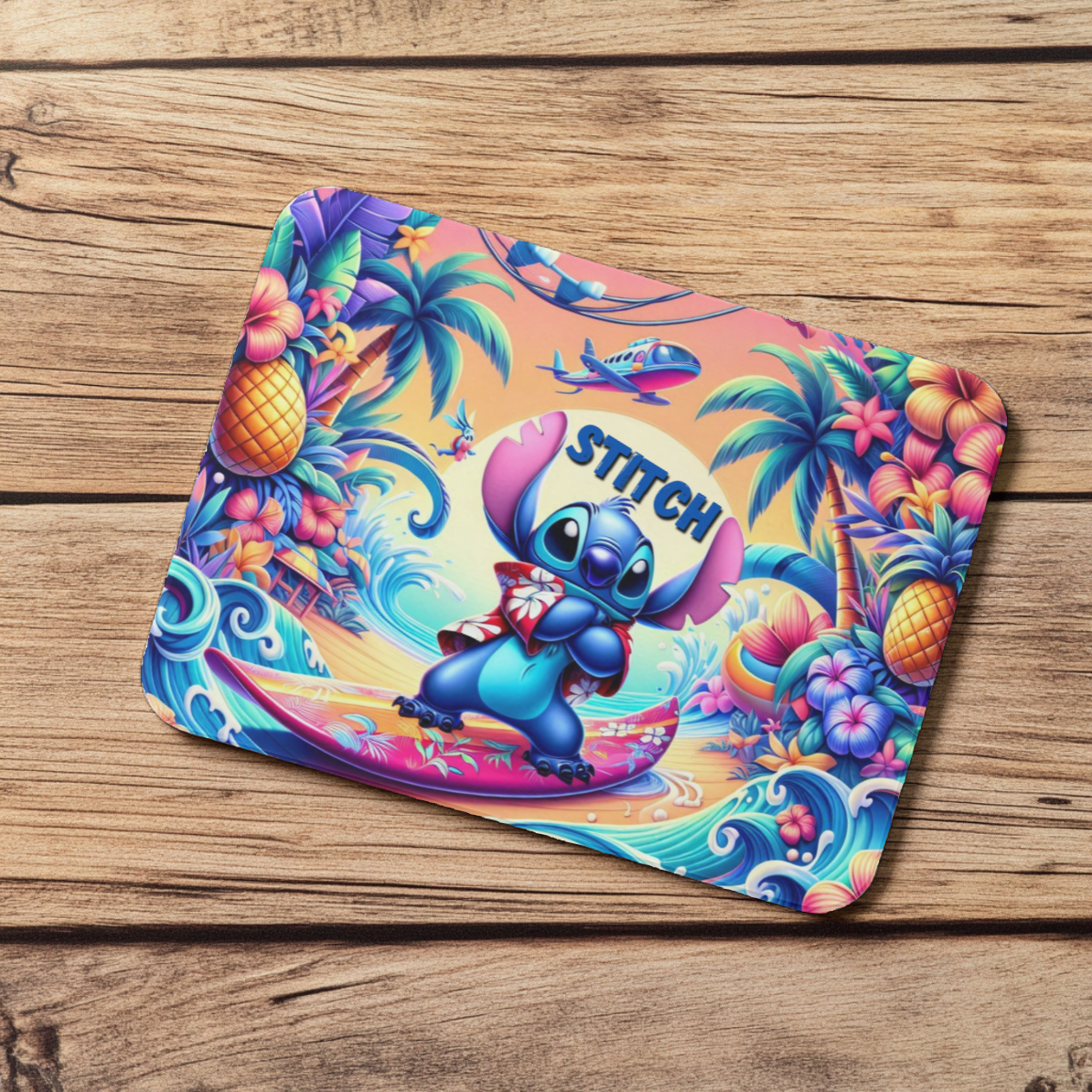 This vibrant mouse pad features the one and only Stitch catching cosmic waves on a hibiscus-studded surfboard, set against a bold tropical backdrop of neon skies, pineapples, and palms. It’s a whole vacation packed into one epic square of mouse-moving magic.