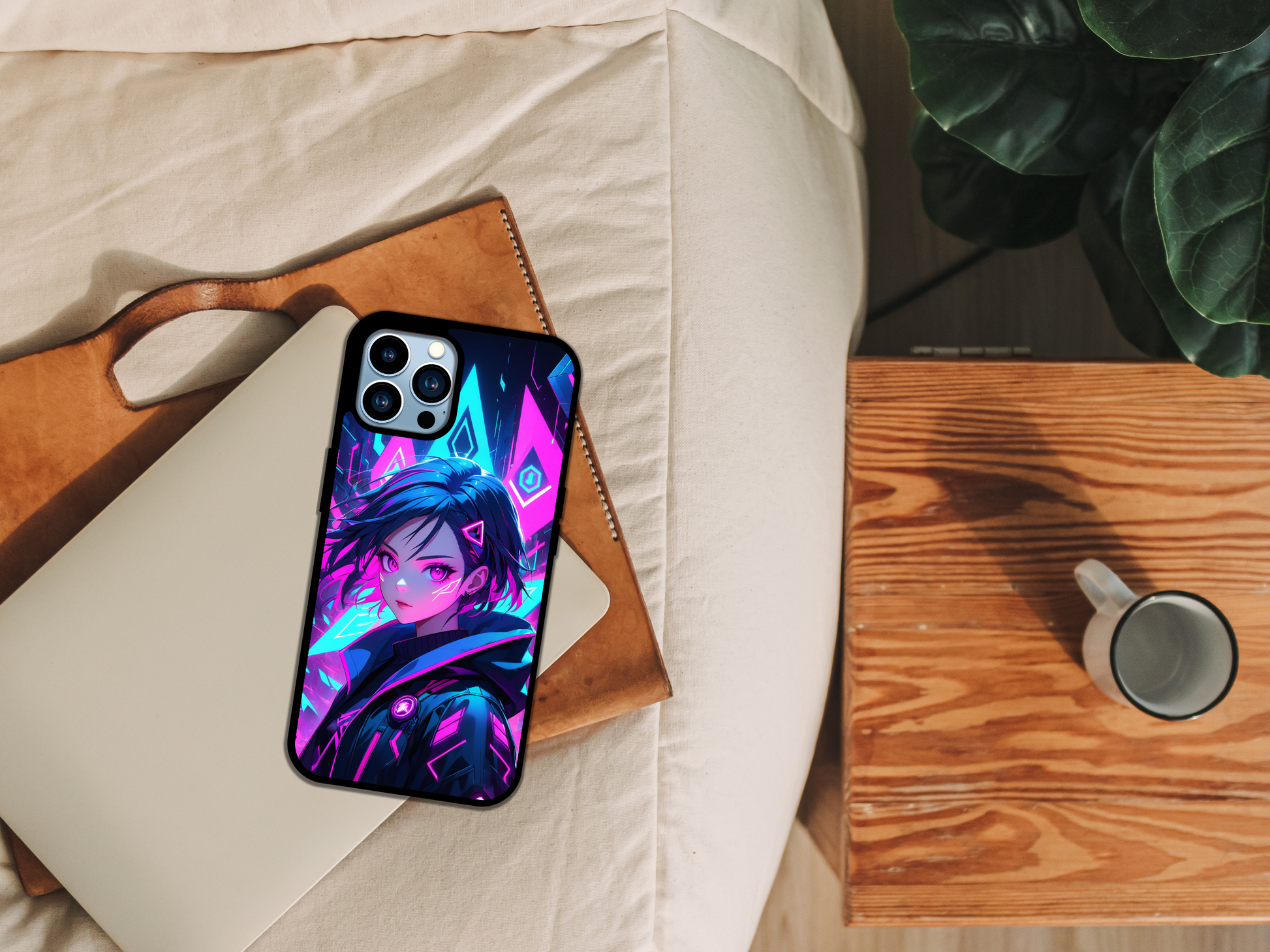 Step into the future with our Neon Cyberpunk Dreamscape – a stunning anime-inspired art print that captures the essence of a futuristic metropolis bathed in electric pinks, vibrant blues, and glowing purples. This piece features a fierce and confident heroine with captivating eyes, neon tattoos, and a sleek, tech-chic outfit, radiating style and strength.