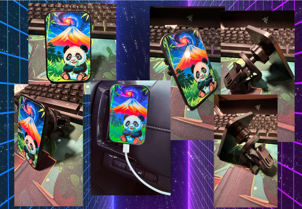 Upgrade your drive with this car vent wireless magnet holder, a stylish and powerful wireless station solution designed to keep your phone secure and fully charged on the go. Featuring Panda and Mount Fuji design, this charger adds personality to your car while delivering wireless power to your phone. Ideally and suitable for iPhone models that support magsafe/wireless charge.