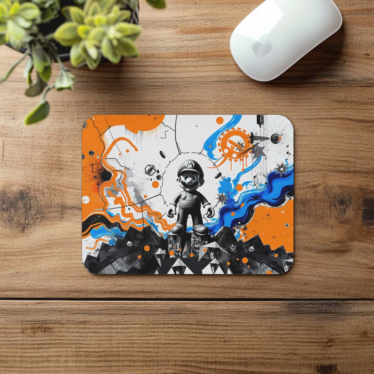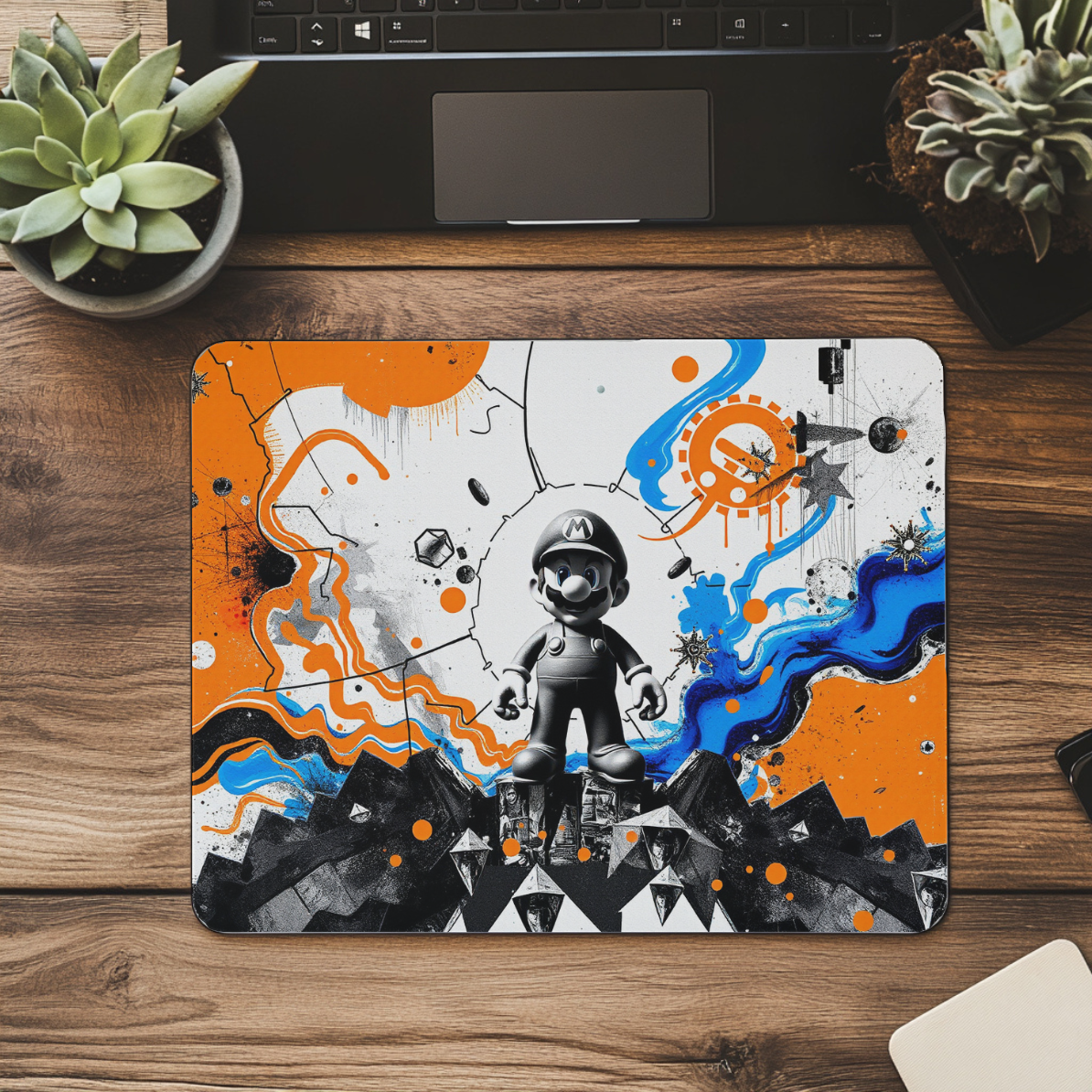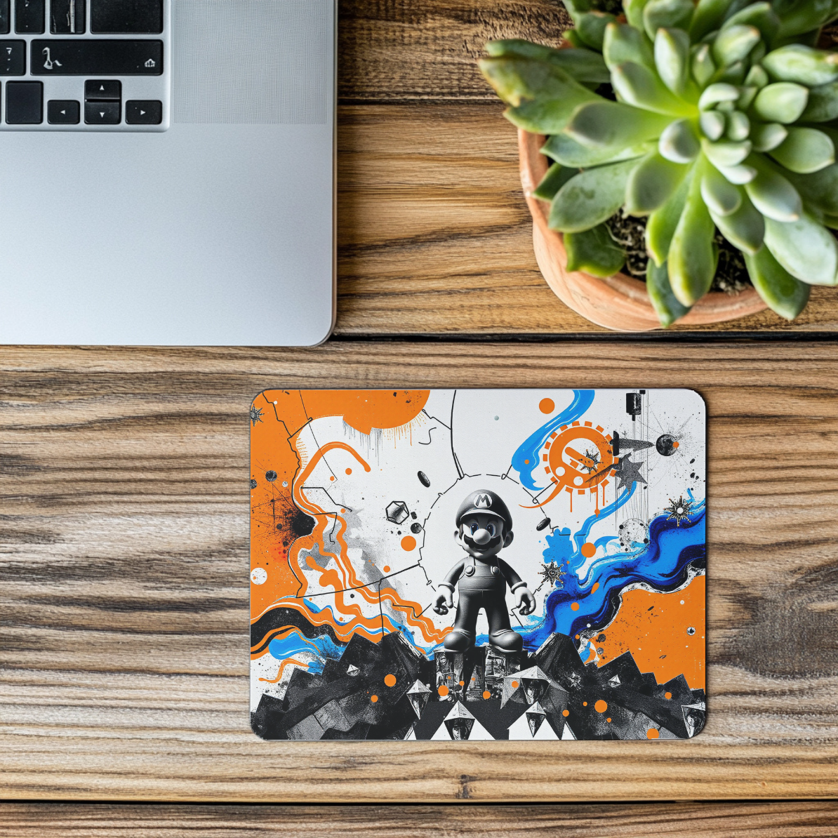 Level up your desk space with the PopArt Power-Up Mousepad, where iconic gaming meets street art. This electrifying design features a bold, black-and-white Mario character standing strong against a background of explosive orange, blue, and abstract graphics. Every detail captures the essence of pop culture and retro gaming, reimagined for the modern gamer.