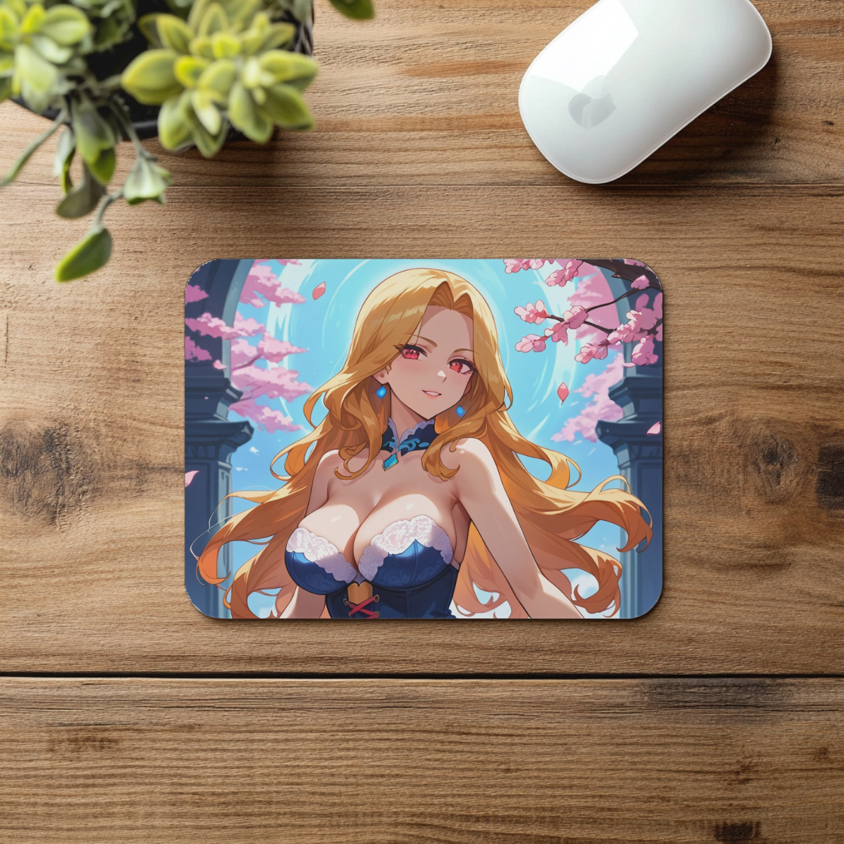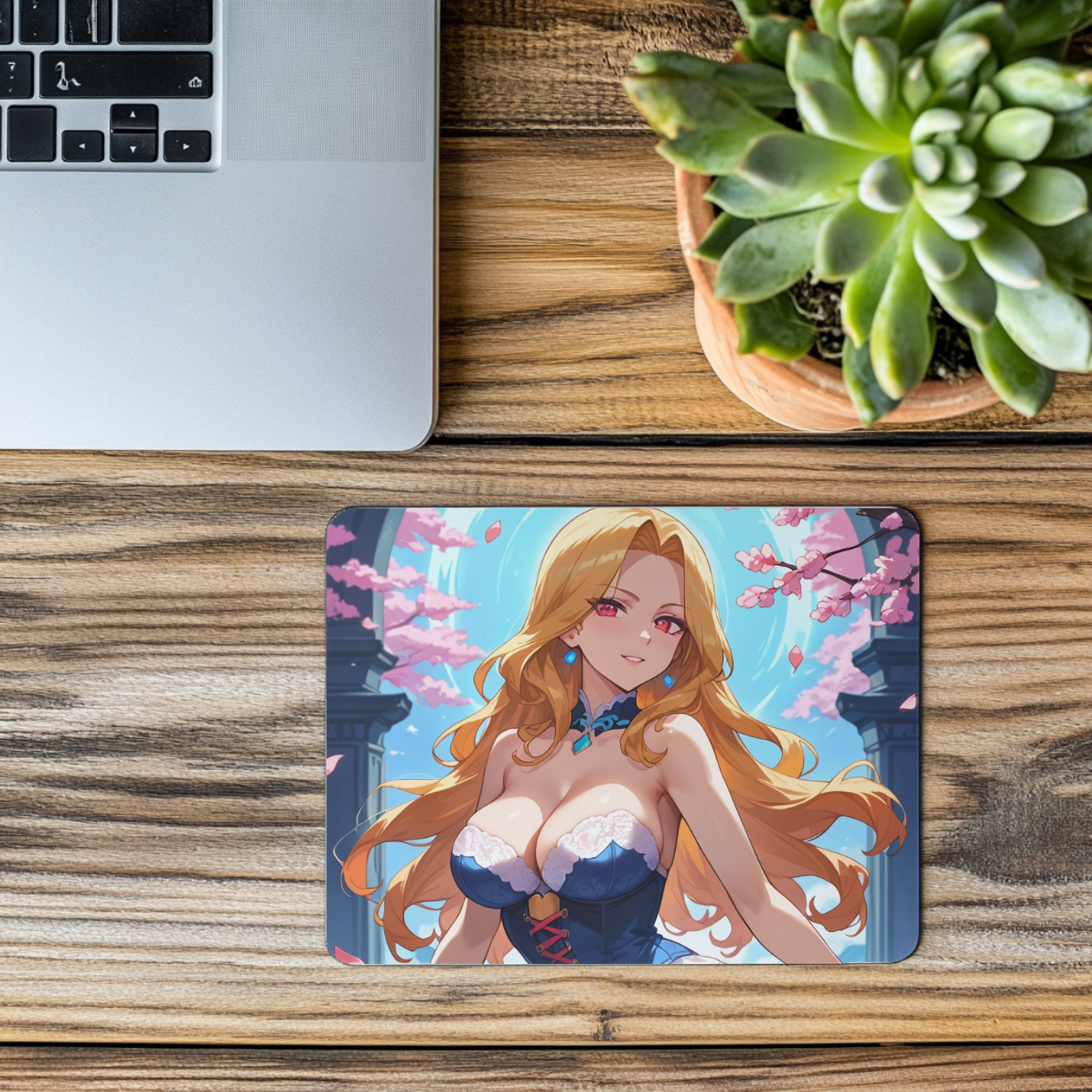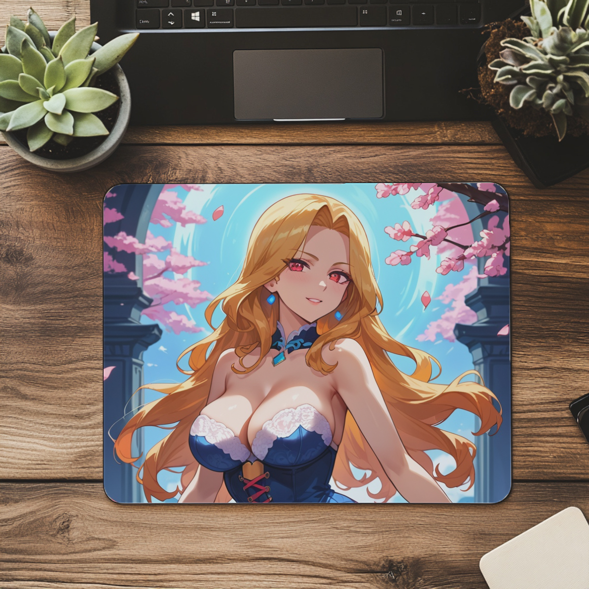 Add a touch of sultry elegance to your workspace with this alluring mousepad design. Featuring a captivating anime beauty with long, flowing golden hair, sparkling red eyes, and a lacy, low-cut corset that teases her curves, she stands beneath a dreamy canopy of pink cherry blossoms. Her gaze and enticing smile promise a moment of playful seduction with every glance. Perfect for those who appreciate a bit of daring flair, this mousepad brings an irresistible, anime-inspired spark to your desk.
