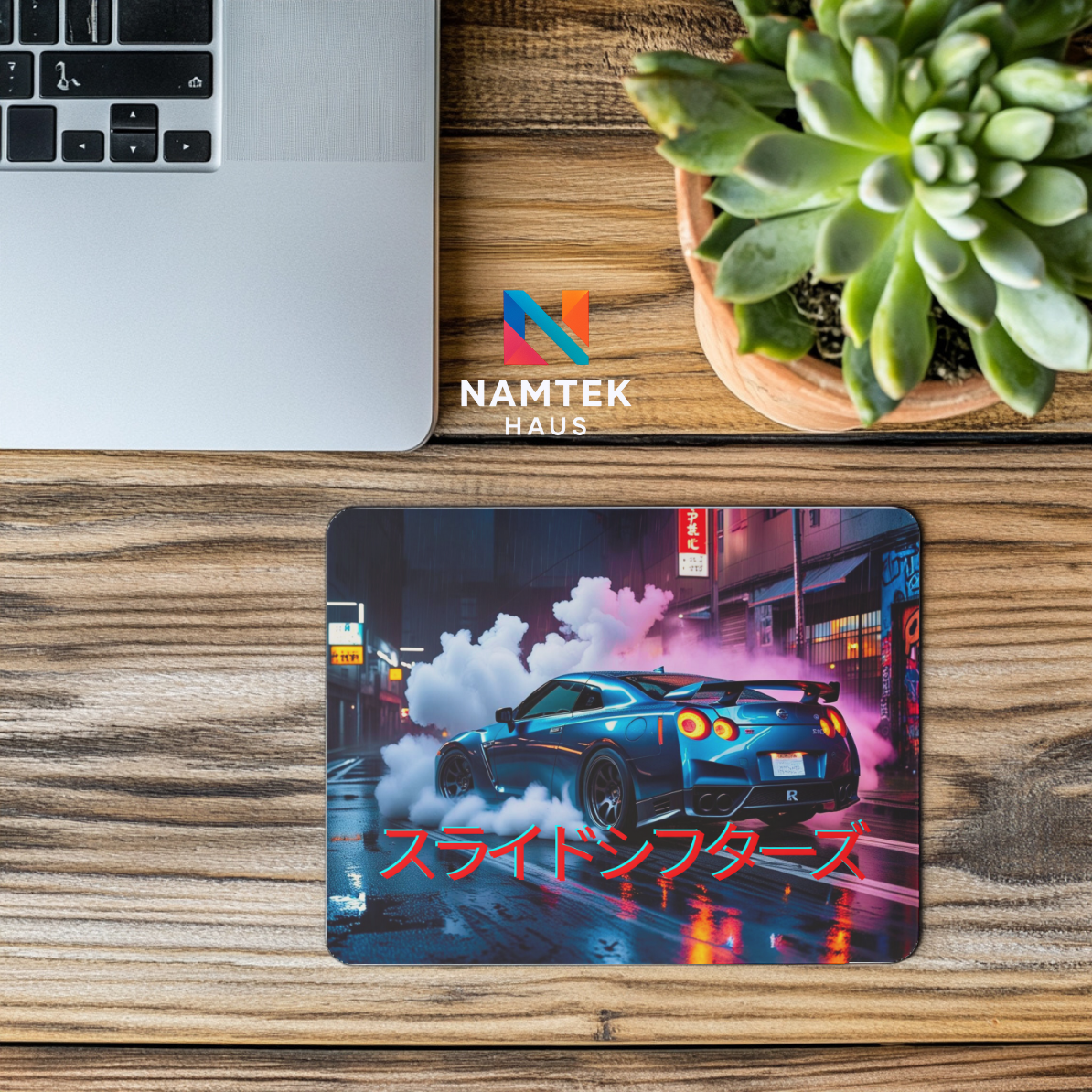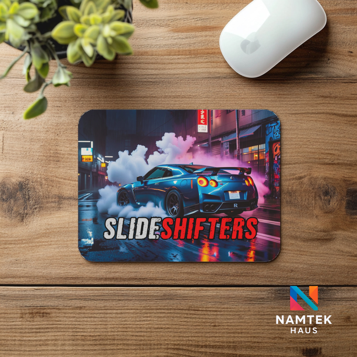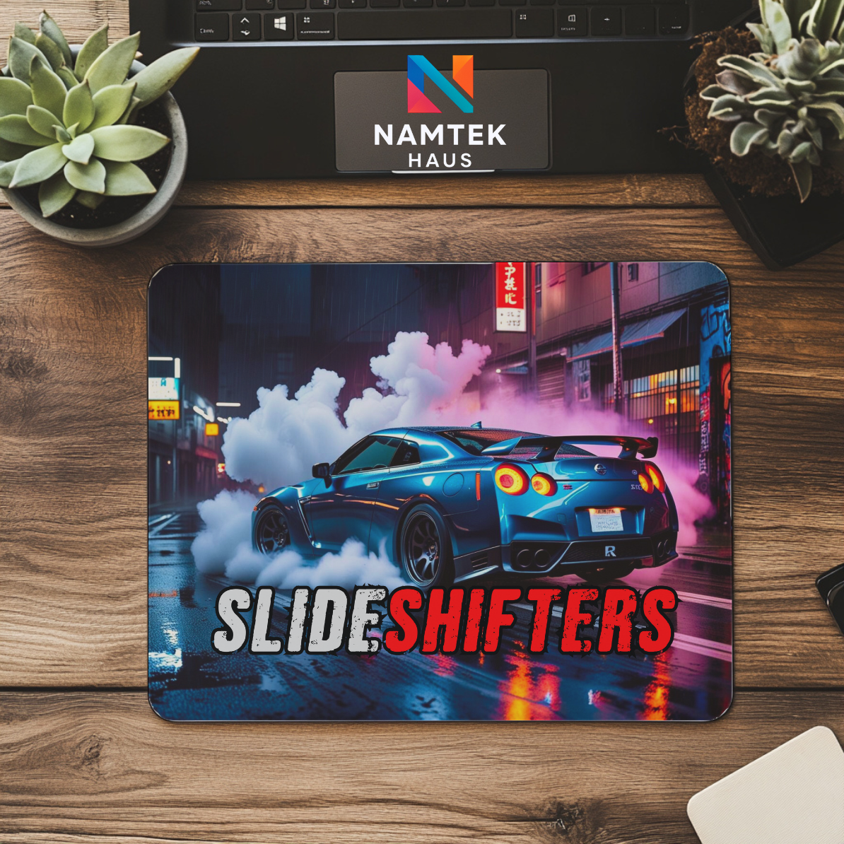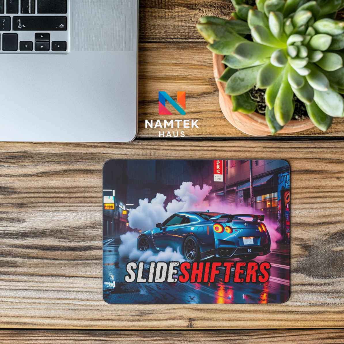 Unleash the thrill of the streets with this dynamic mousepad featuring a blue sports car drifting through neon-lit city streets, leaving a trail of smoke and excitement. Perfect for SlideShifters fans and car enthusiasts alike, this design captures the essence of speed, style, and adrenaline. Elevate your workspace with the spirit of street racing and let every click and scroll take you closer to the finish line.